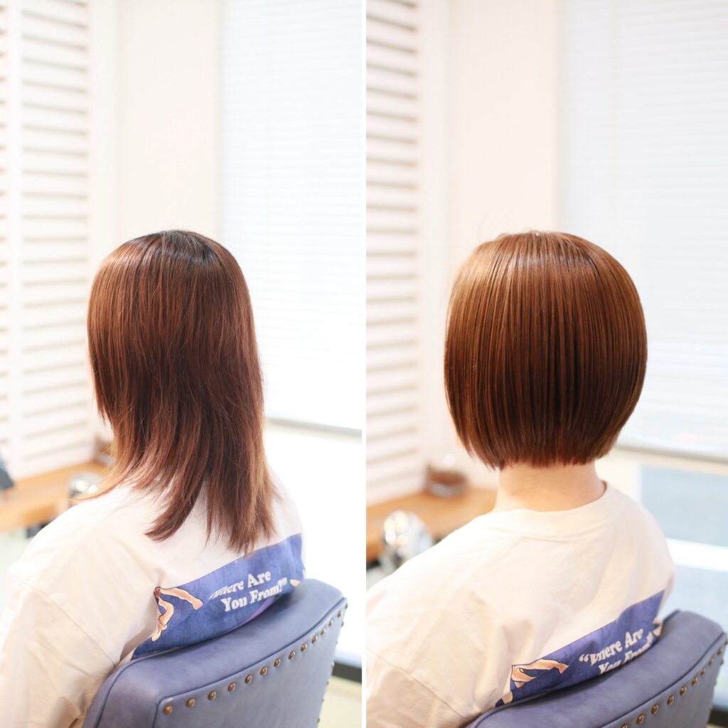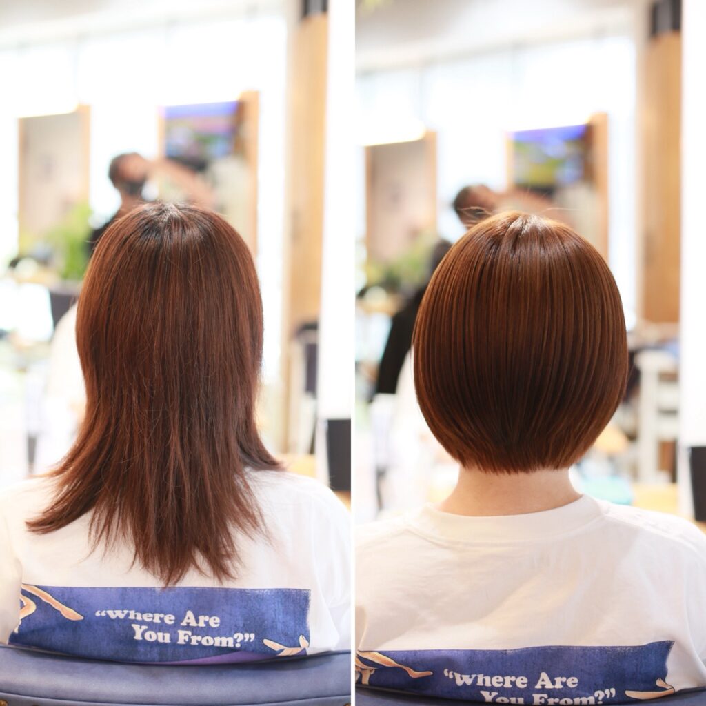 本日のお客様は、肩下まで伸びたセミロングから ショートカット へ大胆イメチェン!