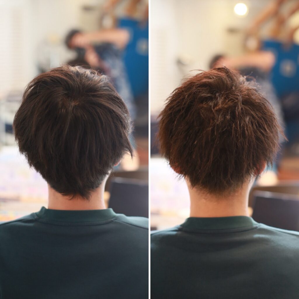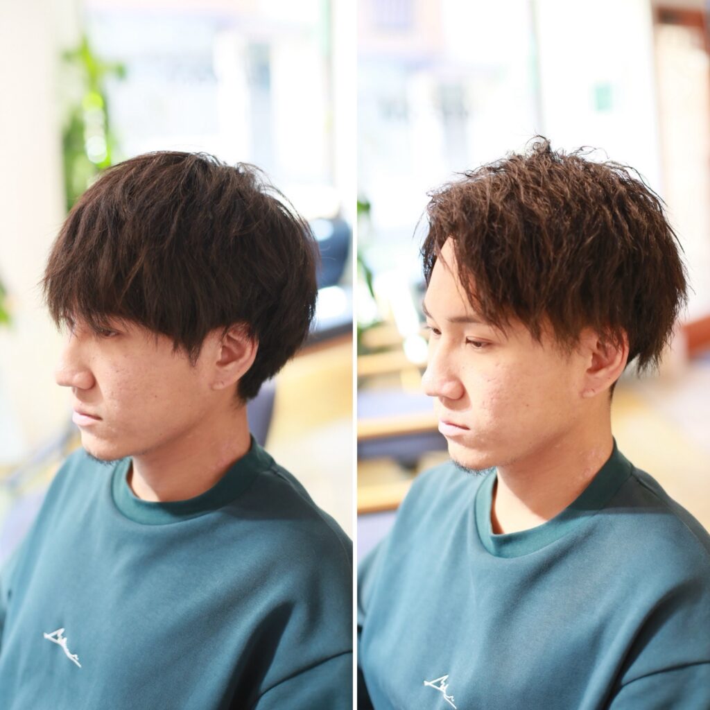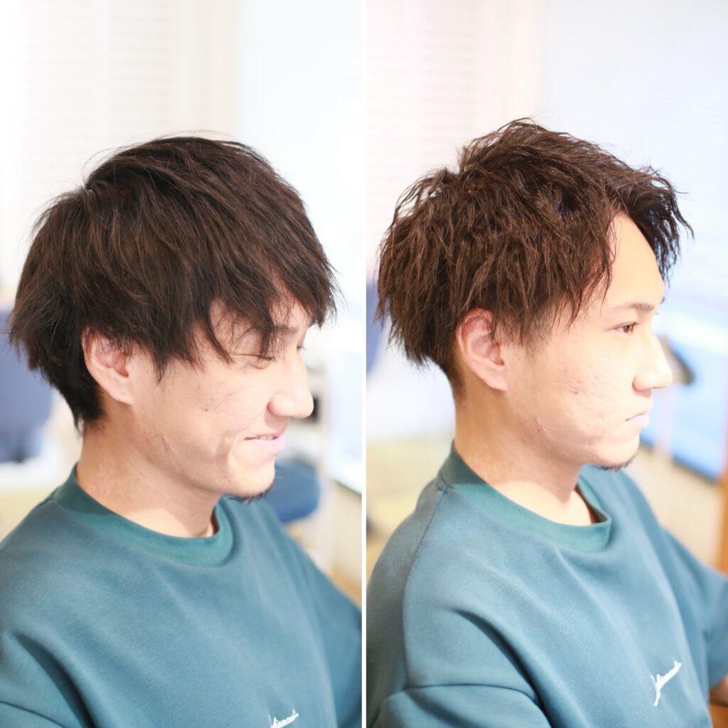 施術前はナチュラルなマッシュベースのスタイルでしたが、ツイスパを加えることで一気に立体感と動きが出て、男らしさとオシャレ感がアップ!サイドは2ブロックでスッキリと刈り上げることで、清潔感も兼ね備えた好印象ヘアに仕上がりました。