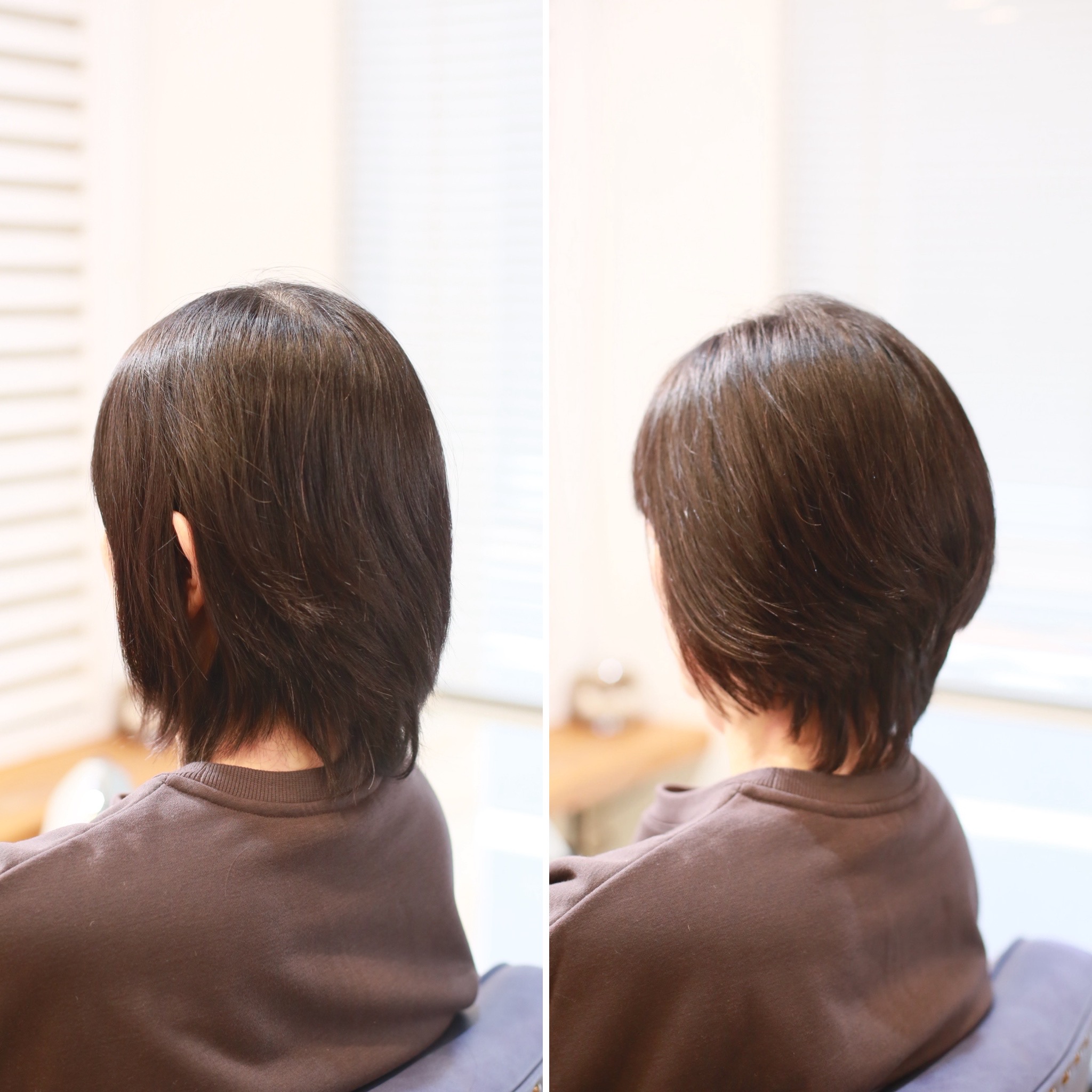 カットで髪質を見極めて施術を組み合わせることで、自然な丸みと首元の収まりを実現しています。