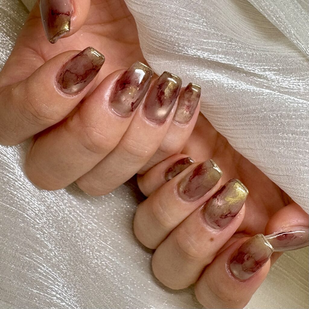 【奥行きニュアンス×ゴールド】 投稿日: 2026年3月2日 投稿者: urbansea.nail.eye@gmail.com 透け感のあるブラウンベースに、 じゅわっと広がる赤みニュアンス。 奥行きのあるデザインに、 さりげなく仕込んだゴールドがアクセントになり、 重くなりすぎず抜け感のある仕上がりに。 光の当たり方で表情が変わるので、 見るたびに違う雰囲気を楽しめるデザインです。 派手すぎないけどしっかりお洒落。 大人っぽく、少しエッジの効いたニュアンスを楽しみたい方におすすめです。 カラーの濃淡やゴールドの入り方は調整可能ですので、 ぜひご相談ください♪ ご予約はこちらから💁♀️