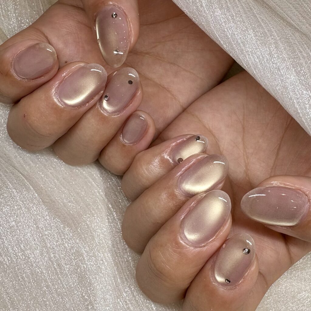 ナチュラル上品なマグネットネイル♪ 投稿日: 2026年3月7日 投稿者: urbansea.nail.eye@gmail.com 肌なじみの良いヌーディーカラーに、やわらかく輝くマグネットを合わせた大人上品なデザイン。派手すぎず、光の角度でふんわりと輝く質感がとても綺麗です! シンプルな中にさりげなくストーンをプラスすることで、上品なアクセントに。オフィスネイルにもぴったりな、落ち着きのあるデザインに仕上がりました♪ ナチュラル系がお好きな方や、上品な雰囲気のネイルを楽しみたい方におすすめです!気になる方はぜひお試しください♪
