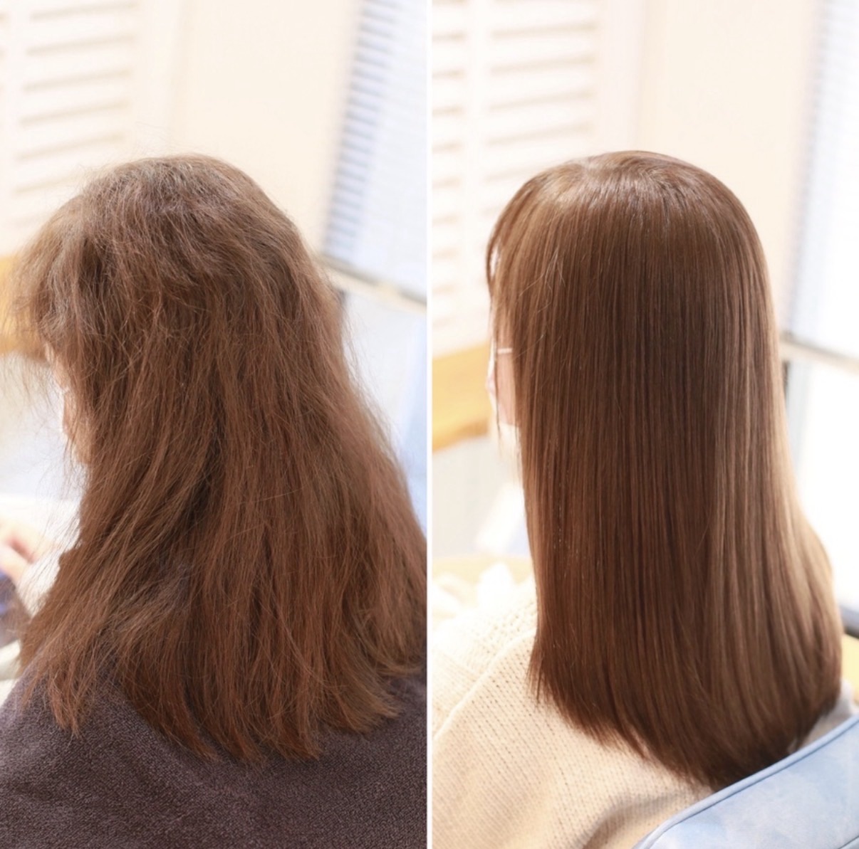 髪質改善ストレートは、髪内部の結合を整えながらストレートに導く施術です◎ ダメージを補修しながら進めるので、髪に優しいのが特徴♪