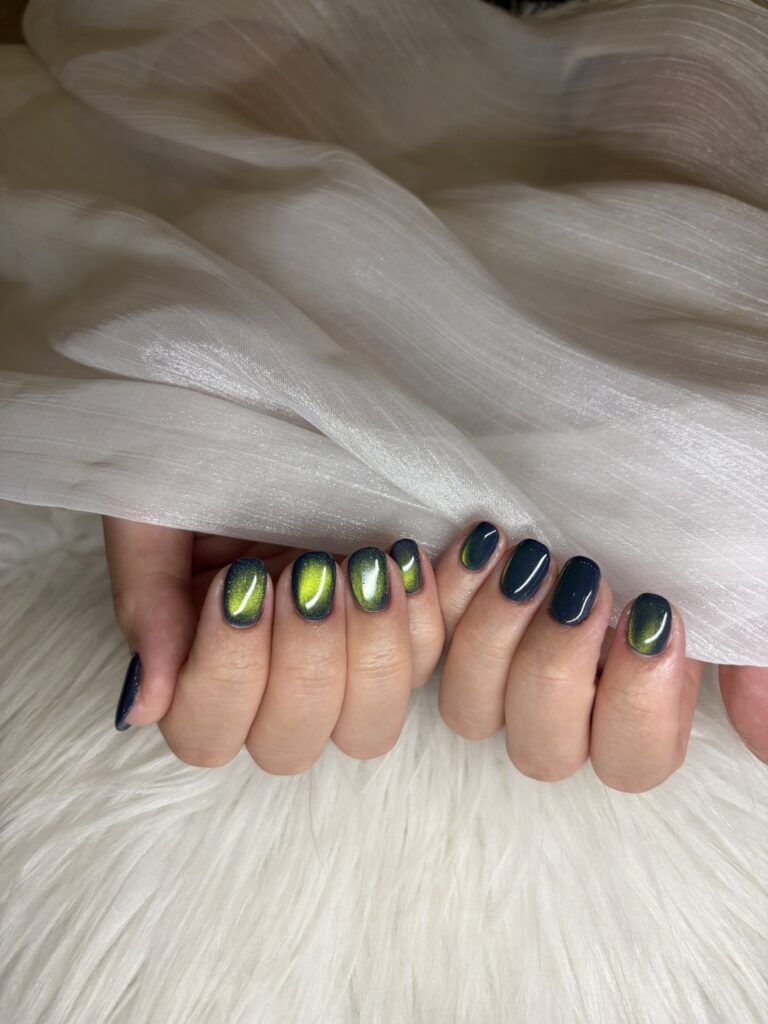 見る角度でインディゴブルーが強くなったり、ライムグリーンが強くなったりしてとっても可愛いです💕是非色々な色のマグネットでお試しください✨